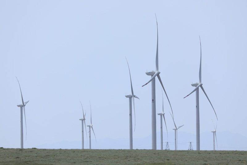 这是2021年5月24日在哈萨克斯坦扎纳塔斯拍摄的风电场的风机。新华社发(奥斯潘诺夫 摄)