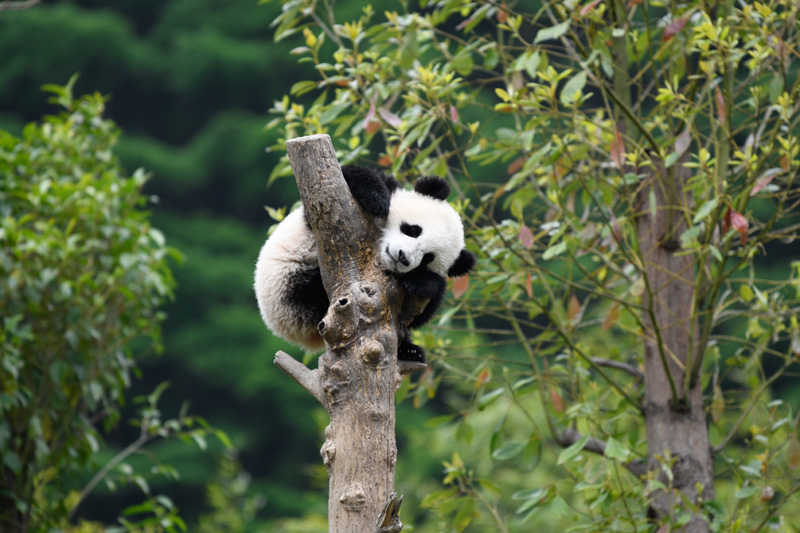 在中国大熊猫保护研究中心卧龙神树坪基地内,一只大熊猫在树上休息(2022年4月24日摄)。新华社记者 胥冰洁 摄