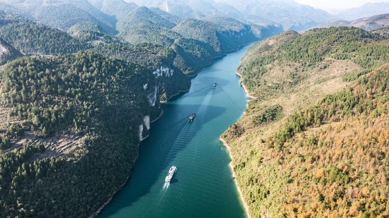 运载磷矿石的货船沿乌江航道顺流航行(2021年11月18日摄,无人机照片)。新华社记者 陶亮 摄