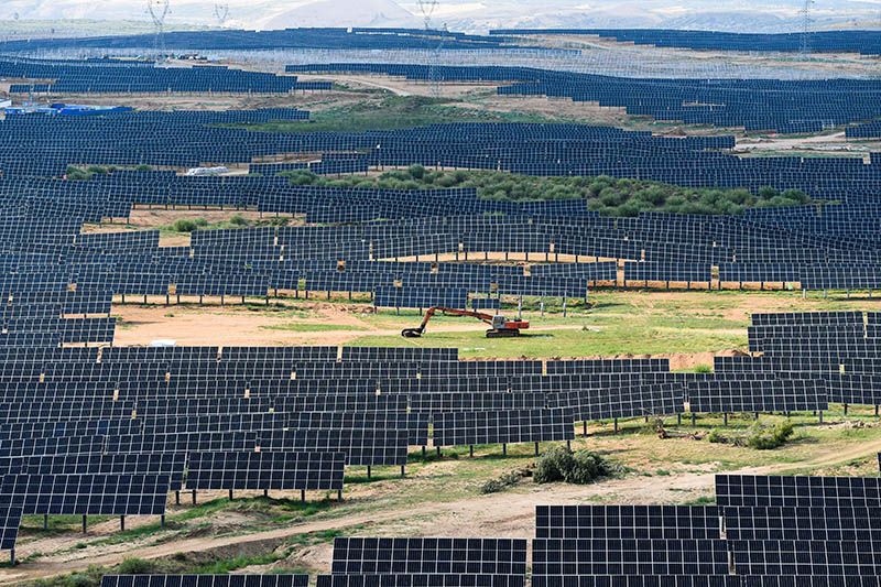 2021年7月13日在内蒙古鄂尔多斯市伊金霍洛旗拍摄的天骄绿能50万千瓦光伏发电项目(无人机照片)。该项目是采煤沉陷区生态治理光伏发电的示范项目。新华社记者 刘磊 摄