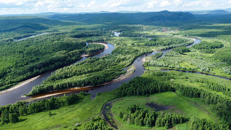 2022年7月7日拍摄的内蒙古满归贝尔茨河国家湿地公园夏日风光(无人机照片)。新华社记者 贝赫 摄