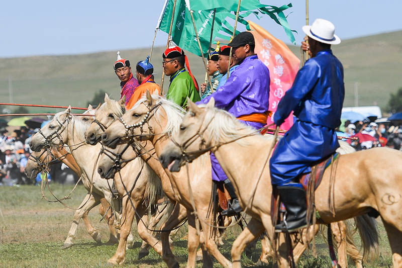 2022年7月29日在内蒙古自治区旅游那达慕开幕式上拍摄的马队。新华社记者 王泽聪 摄