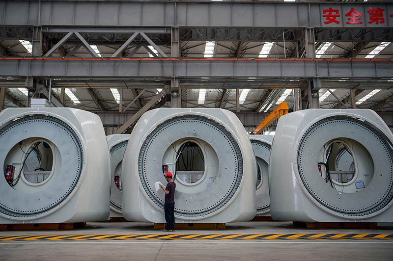 2022年8月2日,工人在内蒙古乌兰察布市运达风电有限公司厂房里检查产品质量。新华社记者 李志鹏 摄