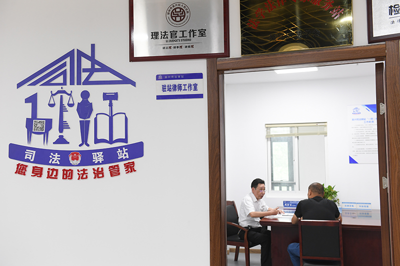 在浙江省湖州市吴兴区八里店镇三合片区党群服务中心“司法驿站”,律师志愿者(左)在提供法务咨询(2020年7月21日摄)。新华社记者 翁忻旸 摄