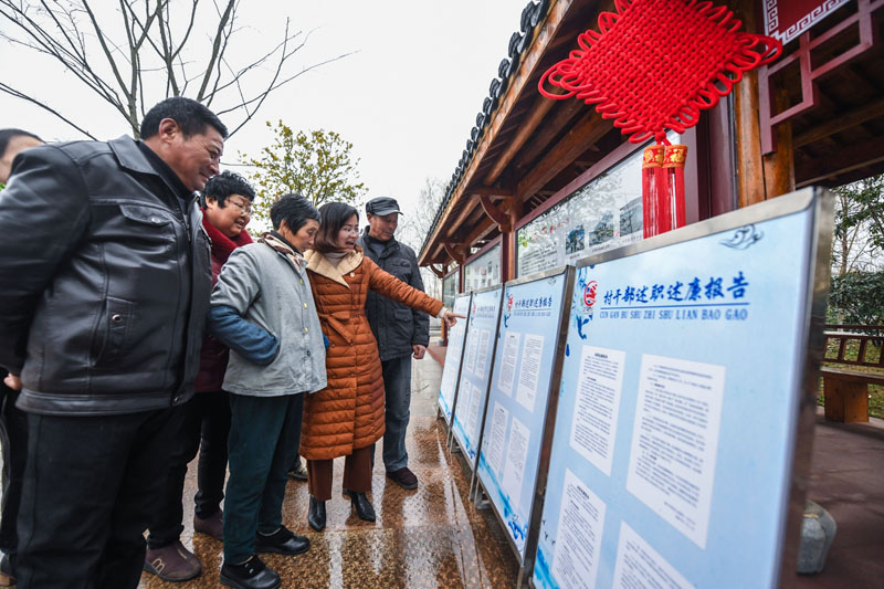 2019年1月15日,浙江省长兴县虹星桥镇港口村党总支委员(右二)向村民介绍2018年度村干部述职述廉情况,接受村民监督。新华社记者 徐昱 摄