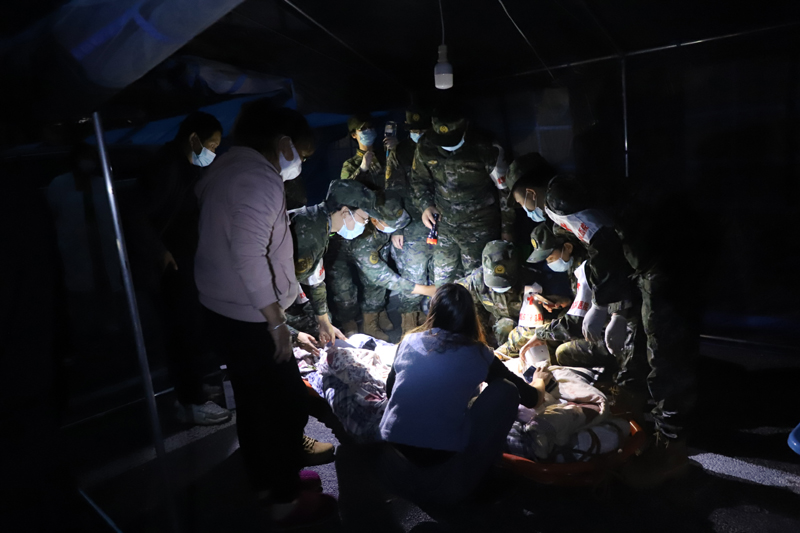 9月5日,武警四川总队医院医疗队在甘孜州泸定县磨西镇贡嘎山王广场救治伤员。新华社发(李华时 摄)