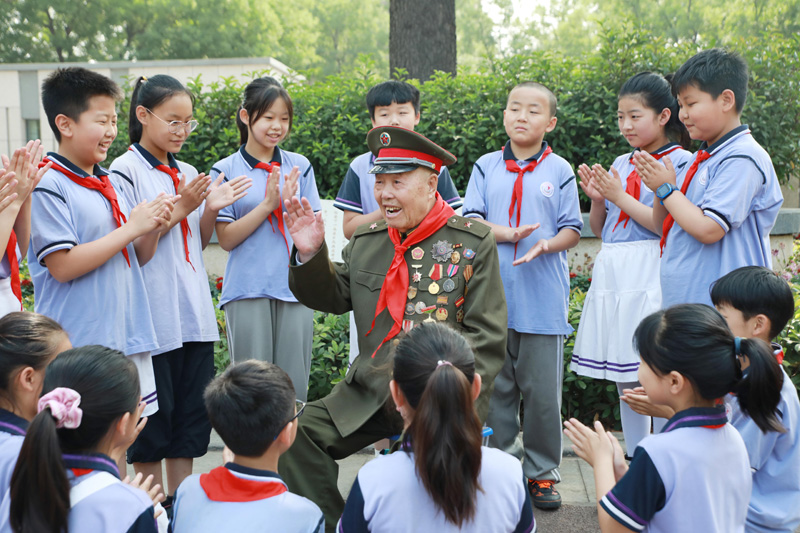 王占山(中)给河南省安阳市三官庙小学的少先队员们讲战斗故事(2021年6月11日摄)。新华社发(戴丹华 摄)