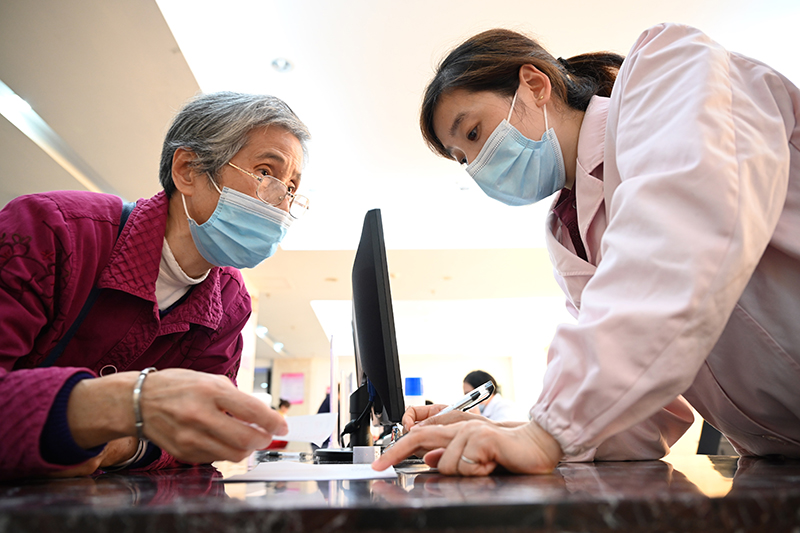 福建省三明市第一医院的医保办工作人员(右)向前来咨询药品报销问题的居民讲解相关政策(2020年11月18日摄)。新华社记者 姜克红 摄