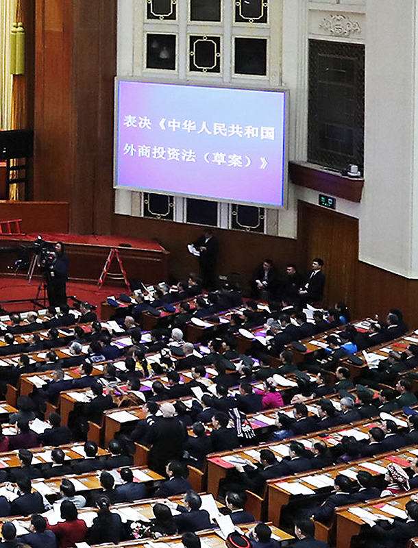 十三届全国人大二次会议在北京人民大会堂举行闭幕会(2019年3月15日摄)。大会通过外商投资法。新华社记者 刘彬 摄