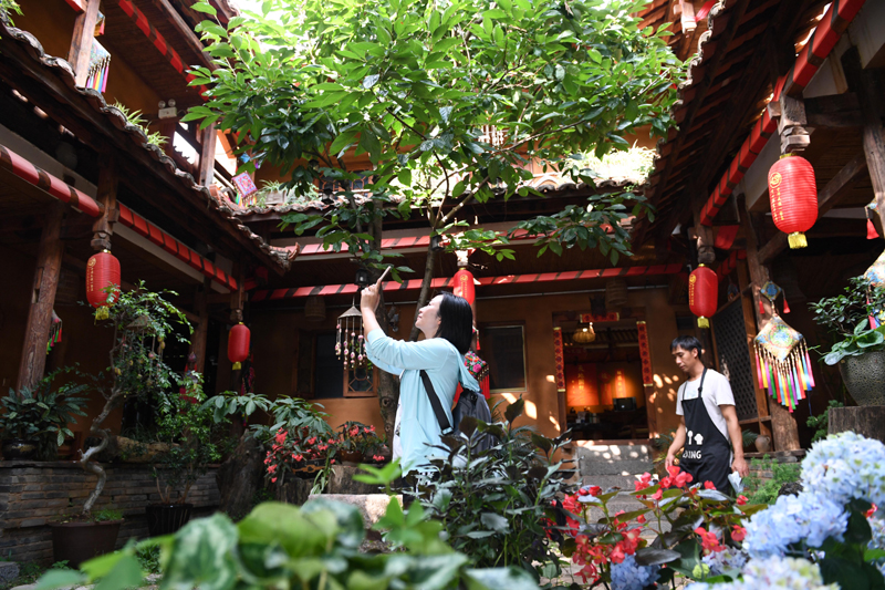 游客在云南省文山壮族苗族自治州丘北县普者黑仙人洞村一家客栈内拍照(2020年6月2日摄)。新华社记者 杨宗友 摄