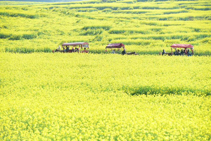 游客乘牛车在云南省曲靖市罗平县的油菜花田中游玩(2022年2月28日摄)。新华社发(毛虹 摄)