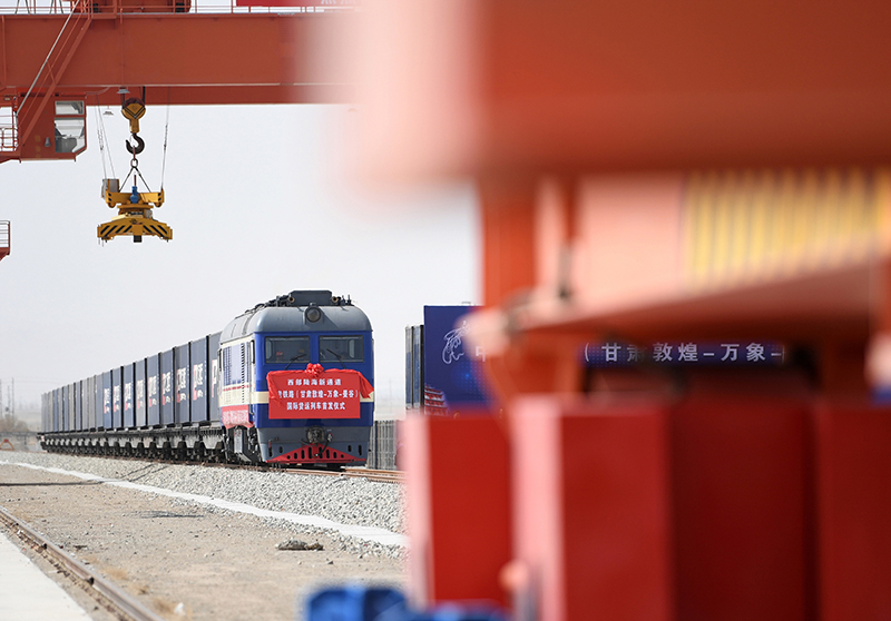 2022年4月21日,甘肃首趟中老铁路国际货运列车在敦煌市铁路西货站综合货场等待发车。新华社记者 陈斌 摄