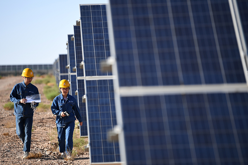 2022年6月13日,光伏电站工作人员李静(右)和同事在甘肃省金昌市华能集团西坡光伏电站现场巡检。新华社记者 陈斌 摄