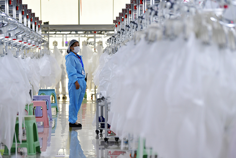 在甘肃省临夏回族自治州积石山保安族东乡族撒拉族自治县,依托东西部扶贫协作平台引进的服装加工企业甘肃拓奇扶贫车间的员工在服装加工生产线上作业(2020年8月9日摄)。新华社记者 陈斌 摄