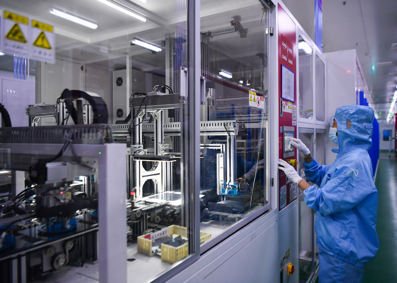 2022年7月19日,工作人员在位于陕西西安的隆基绿能科技股份有限公司单晶硅太阳能电池工厂内调试设备。新华社记者 张博文 摄