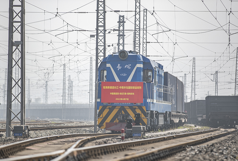 陆海新通道长江-中南半岛国际联运班列(中国果园港-老挝万象-缅甸仰光)从重庆果园港发出(2022年4月7日摄)。新华社记者 黄伟 摄