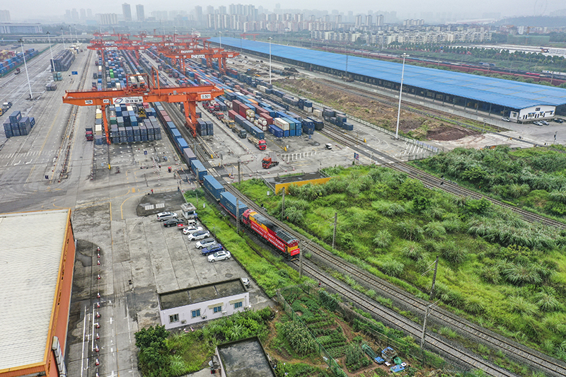 满载着电子产品、机械零件、日用百货等货物的中欧班列(重庆)第10000列列车从重庆团结村中心站驶出(2022年6月23日摄,无人机照片)。新华社记者 黄伟 摄
