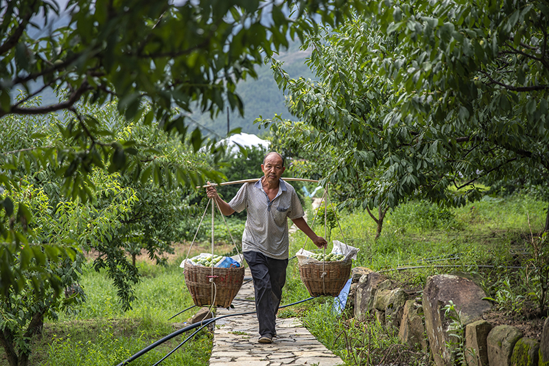 在巫山县曲尺乡柑园村,村民张兴前在挑运脆李(2022年7月2日摄)。新华社记者 黄伟 摄