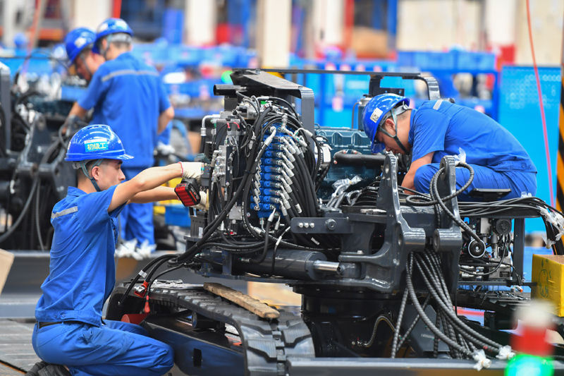 在位于湖南长沙经开区的山河智能装备股份有限公司,工作人员在组装机械装备(2022年7月1日摄)。新华社记者 陈泽国 摄