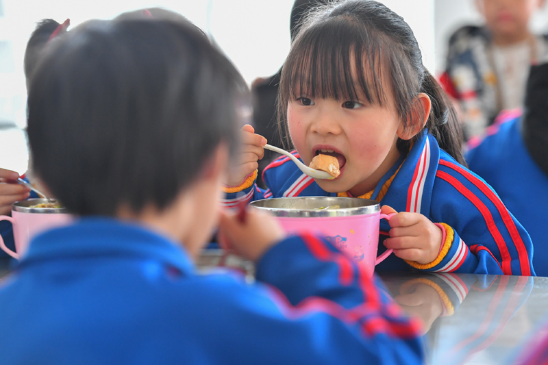 在位于湖南省汝城县文明瑶族乡沙洲村的沙洲芙蓉学校,学生在食堂吃午餐(2022年1月12日摄)。新华社记者 陈泽国 摄