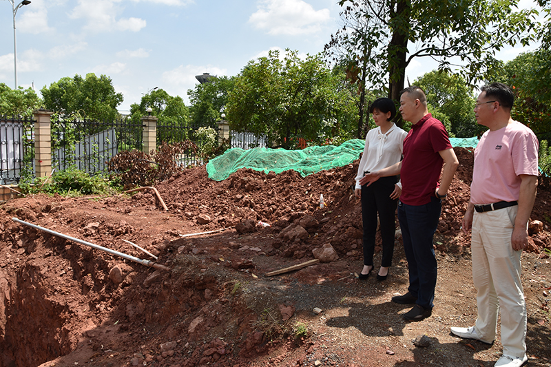 湖南一格制药有限公司工作人员和联企干部讨论管道开挖方案(2022年7月20日摄)。新华社记者 白田田 摄