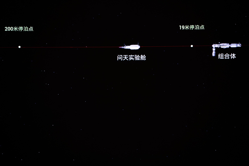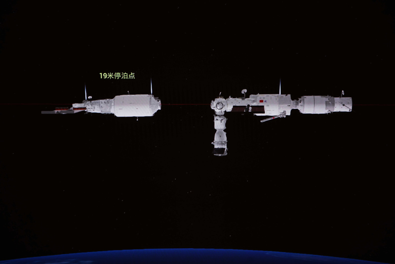 7月25日在北京航天飞行控制中心拍摄的问天实验舱与空间站组合体交会对接。这是问天实验舱从19米停泊点向天和核心舱前向端口靠近。新华社记者 郭中正 摄