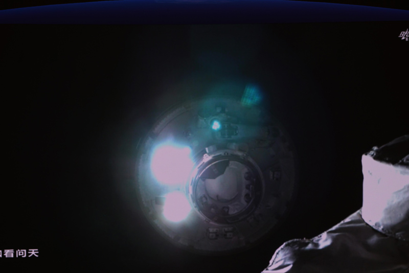 7月25日在北京航天飞行控制中心拍摄的问天实验舱与空间站组合体交会对接。这是问天实验舱成功对接于天和核心舱前向端口。新华社记者 郭中正 摄