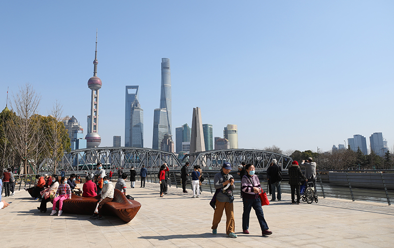 人们在上海苏州河边漫步休闲(2021年2月21日摄)。新华社记者 方喆 摄