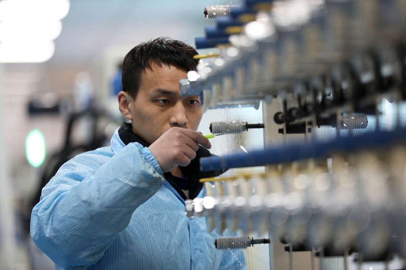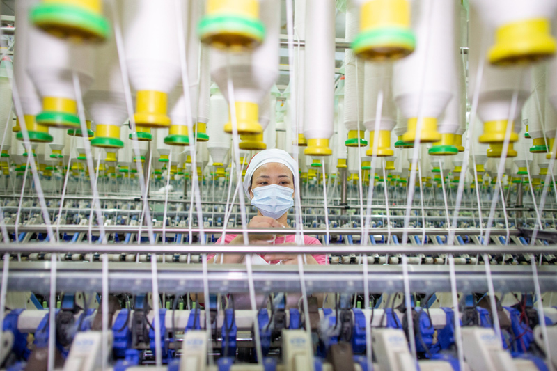 7月15日,江苏省海安市南莫镇一家纺织公司生产车间内,工人在生产线上工作。新华社发(翟慧勇 摄)