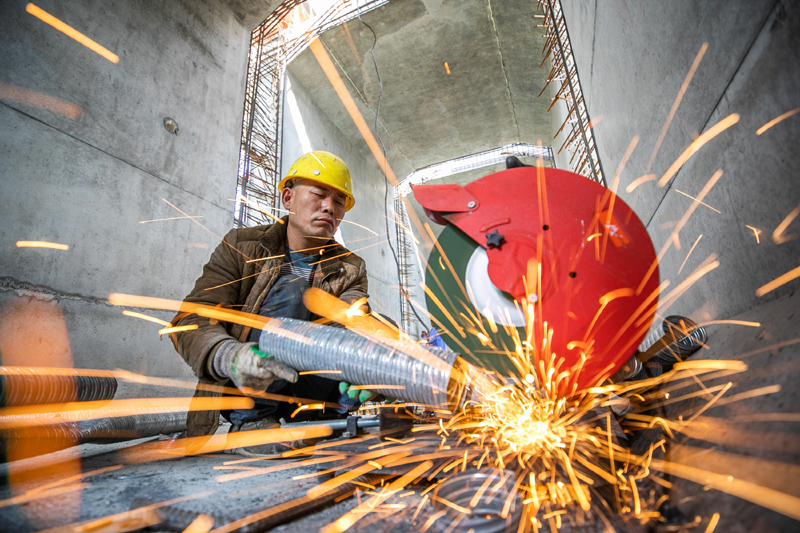 工人在贵州省毕节市叙毕铁路五里坪特大桥施工现场作业(2022年4月29日摄)。新华社发(罗大富 摄)