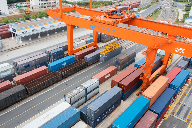 7月15日,在铁路南京尧化门站货场,工作人员吊运集装箱进行装车作业(无人机照片)。新华社发(苏阳 摄)