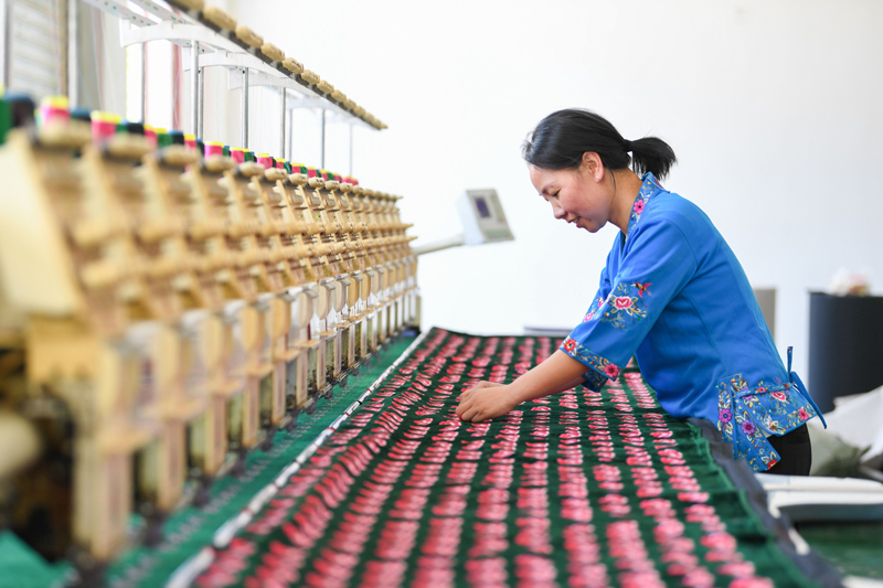 7月15日,在贵州省黔东南苗族侗族自治州施秉县一家苗族绣娘就业工坊,绣娘在赶制刺绣订单。新华社发(蔡兴文 摄)