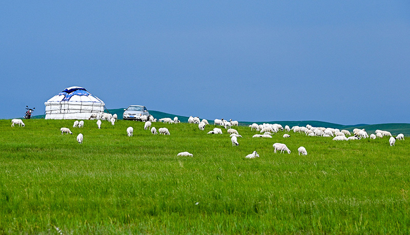 几场夏雨过后,敕勒川草原绿草滴翠、红花吐蕊。