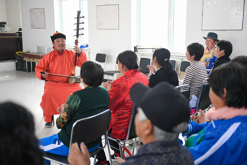 内蒙古兴安盟科尔沁右翼中旗巴彦敖包嘎查的蒙古族村民在乡村文化活动室表演蒙古族艺术乌力格尔(2019年4月17日摄)。新华社记者 彭源 摄