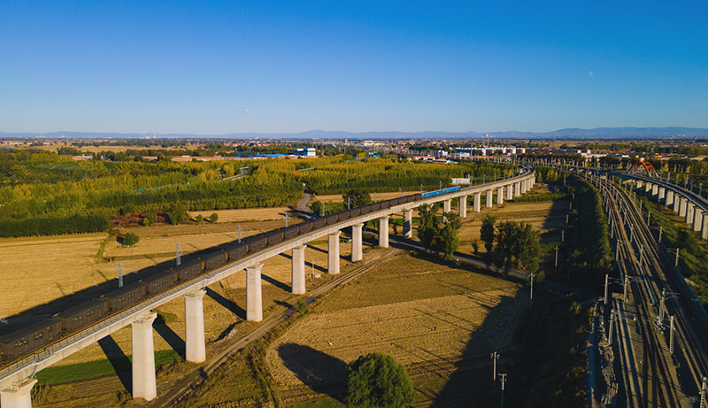 这是在内蒙古呼和浩特拍摄的运煤专列(2021年10月15日摄,无人机照片)。新华社发(夏亮 摄)