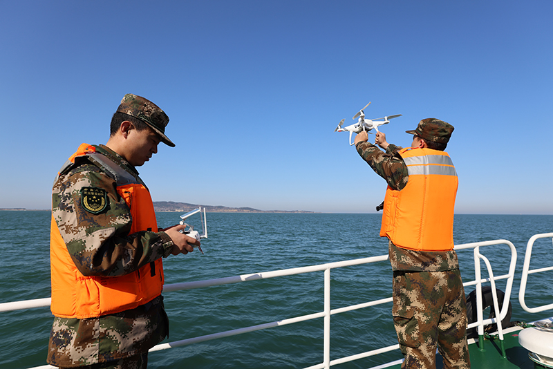 山东海警局执法员利用无人机进行海域执法搜查(2022年4月1日摄)。新华社发(韩刚 摄)
