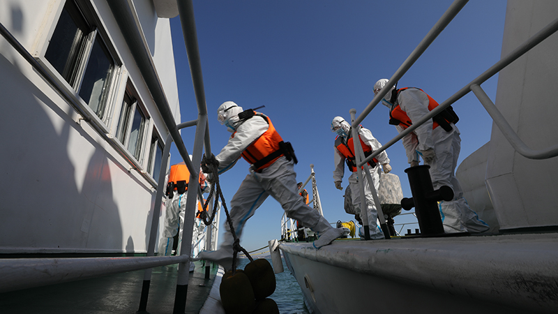 山东海警局执法员跳帮嫌疑船只进行检查(2022年4月1日摄)。新华社发(韩刚 摄)
