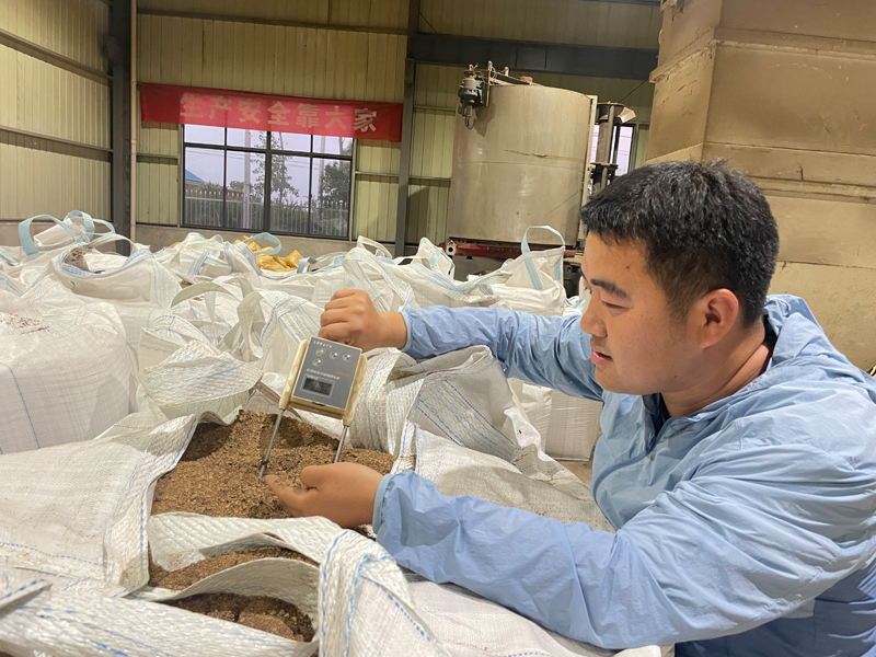 7月7日,安徽省滁州市天长市种粮大户平东林在秸秆炭化厂房用水分测定仪检测秸秆炭粉水分指标。新华社发(朱礼明 摄)