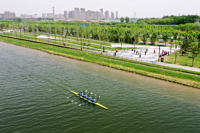 山西皮划艇队队员在汾河太原城区晋阳桥段水面上训练(2020年5月12日摄,无人机照片)。新华社记者 曹阳 摄