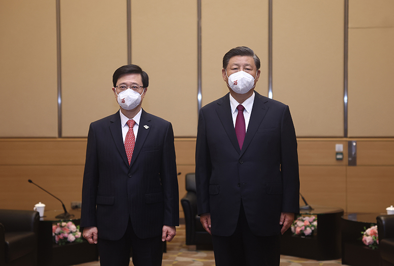 7月1日上午,国家主席习近平在香港会见刚刚就职的香港特别行政区行政长官李家超。新华社记者 鞠鹏 摄