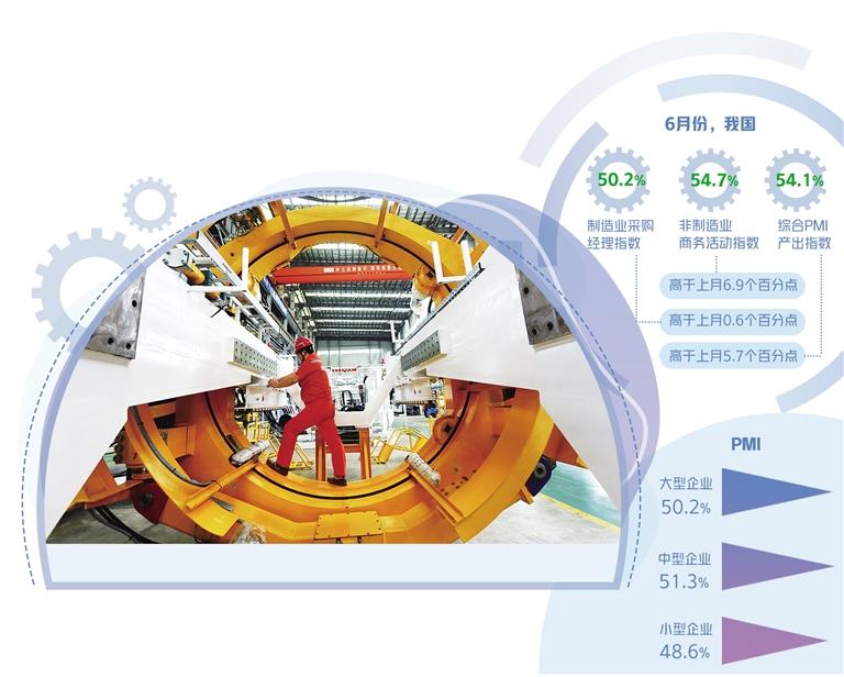 随着国内疫情防控形势持续向好,稳经济一揽子政策措施加快落地生效,我国经济总体恢复有所加快。6月30日,国家统计局服务业调查中心、中国物流与采购联合会发布的中国采购经理指数显示,6月份,制造业采购经理指数、非制造业商务活动指数和综合PMI产出指数分别为50.2%、54.7%和54.1%,高于上月0.6个、6.9个和5.7个百分点,均升至扩张区间。