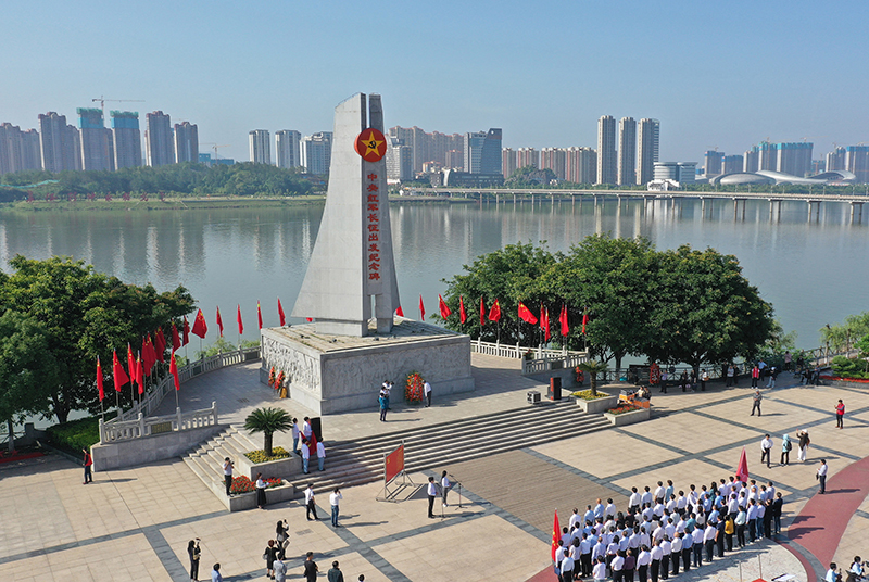 人们在江西省于都县中央红军长征出发纪念碑前参加纪念活动(2021年4月30日摄,无人机照片)。新华社记者 万象 摄