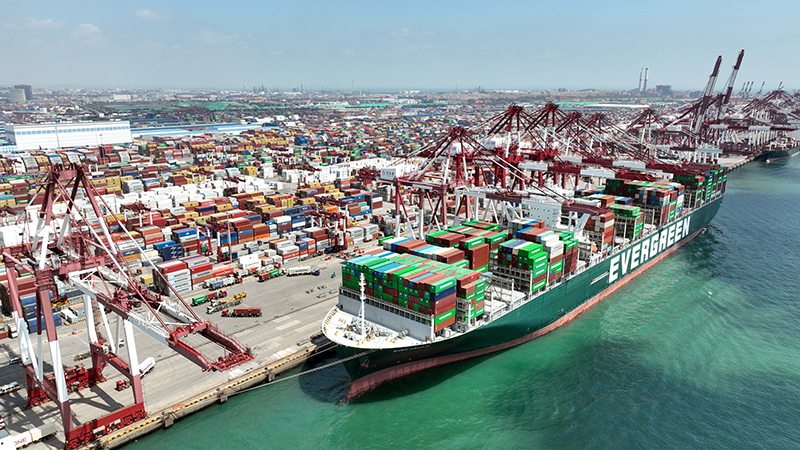 山东港口青岛港前湾港区,集装箱货轮在码头装卸集装箱(2022年6月15日摄,无人机照片)。新华社记者 李紫恒 摄