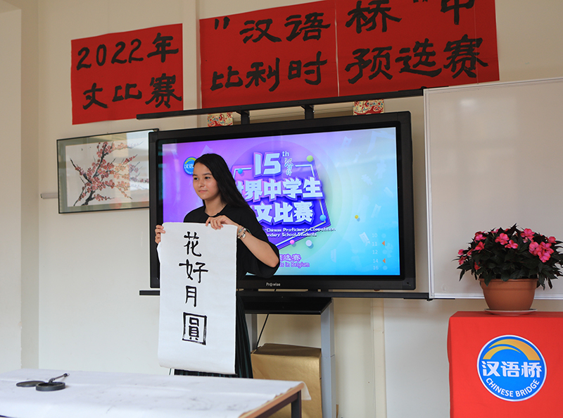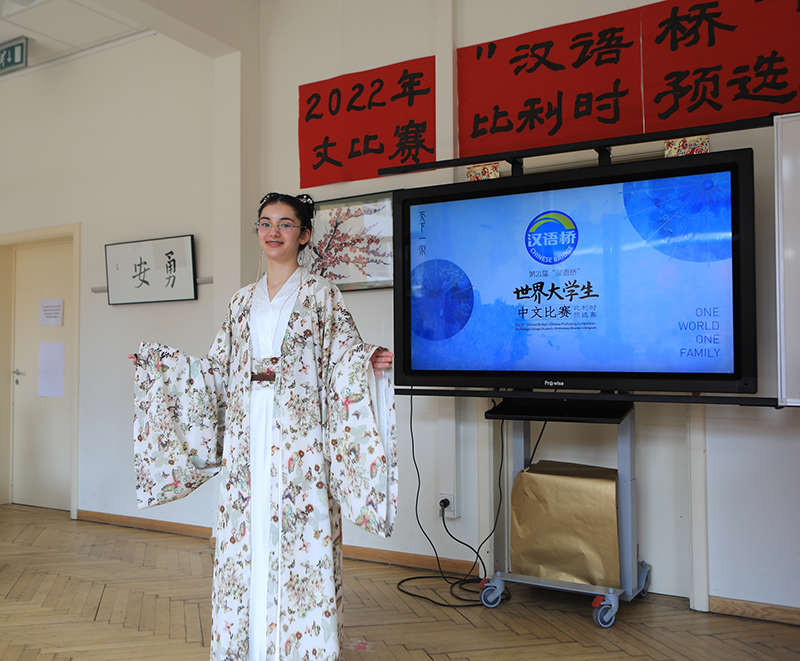比赛分为主题演讲、才艺展示和知识问答三个环节。大学生演讲的主题是“天下一家”,中学生演讲的主题是“追梦中文,不负韶华”。选手们分别从学习中文、了解中国文化、加强中比友谊等视角阐述了自己的见解。在才艺展示环节,选手们则通过书法、舞蹈、汉服展示、诗朗诵、歌唱和器乐演奏等,表达对中国文化的理解和喜爱。