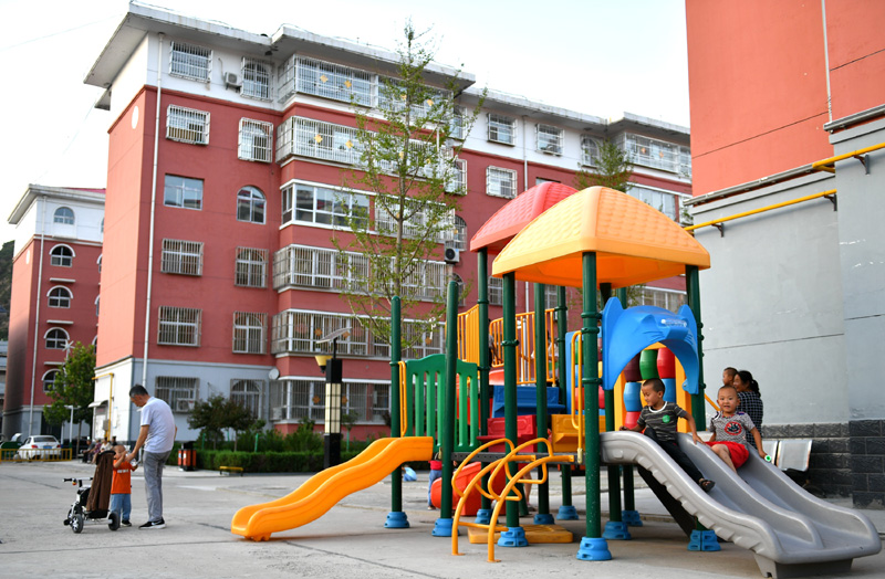 在陕西省延安市延川县文安驿镇梁家河小区,小朋友在滑梯上玩耍(2020年7月29日摄)。新华社记者 张博文 摄