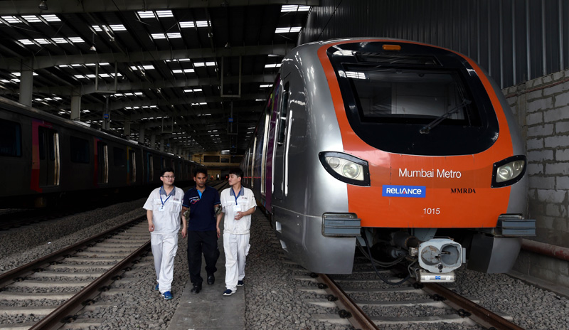 2018年6月27日,在印度孟买,中印双方工作人员在孟买地铁一号线车辆段工作。该地铁线路车辆由中车南京浦镇车辆有限公司制造。新华社记者 张迺杰 摄