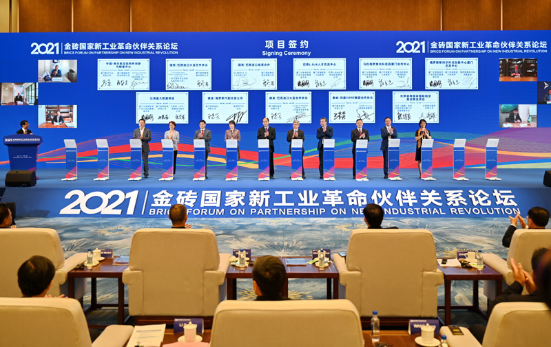 在福建厦门举行的2021金砖国家新工业革命伙伴关系论坛期间,金砖国家新工业革命伙伴关系创新基地举行签约仪式(2021年9月7日摄)。新华社记者 林善传 摄