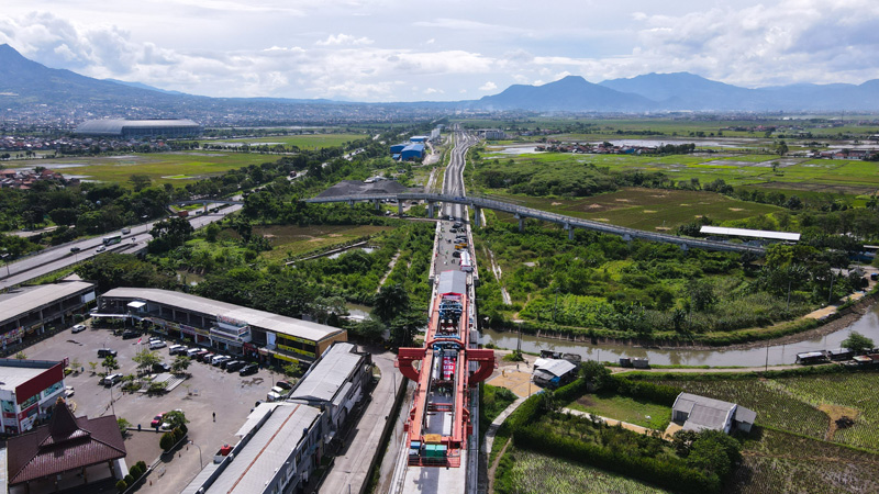 这是2022年5月25日在印度尼西亚万隆拍摄的雅万高铁4号梁场万隆方向架梁通道上最后一榀箱梁架设现场(无人机照片)。新华社记者 徐钦 摄