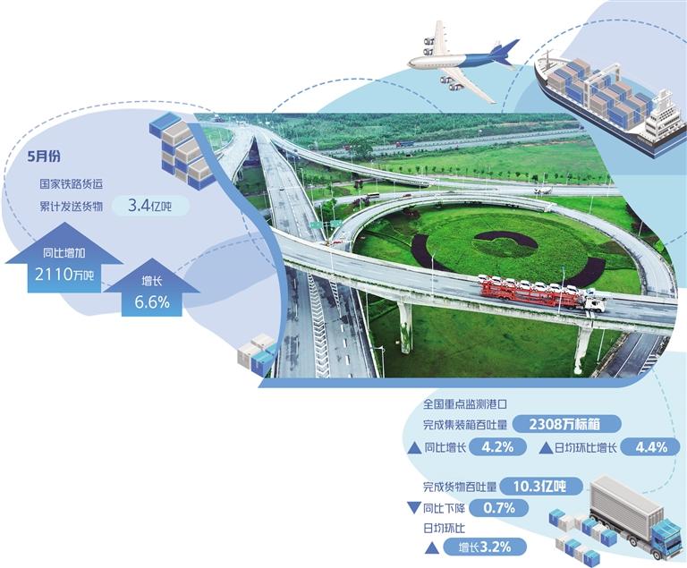 中国国家铁路集团有限公司数据显示,5月份,国家铁路货运保持强劲增长态势,累计发送货物3.4亿吨,同比增加2110万吨,增长6.6%,单月货物发送量再创新高。