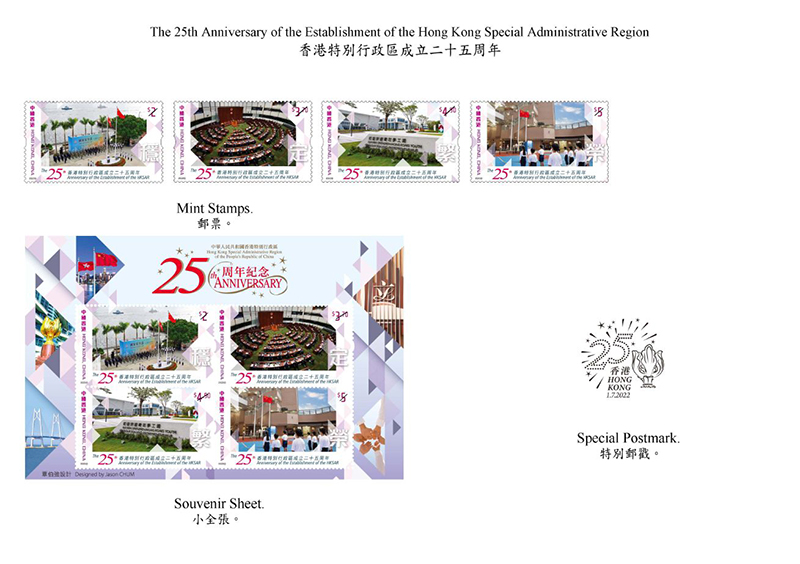 2022年是香港特区成立25周年。香港邮政发行一套四枚纪念邮票、一张小全张和相关集邮品,以资纪念。邮票展示实施香港国安法及完善选举制度后的香港,回到“一国两制”的正确轨道。同时,邮票也带有培养学生国民身份认同,以及香港更积极融入国家发展大局,在未来数十年为年轻人和企业带来广阔发展机遇的内容。